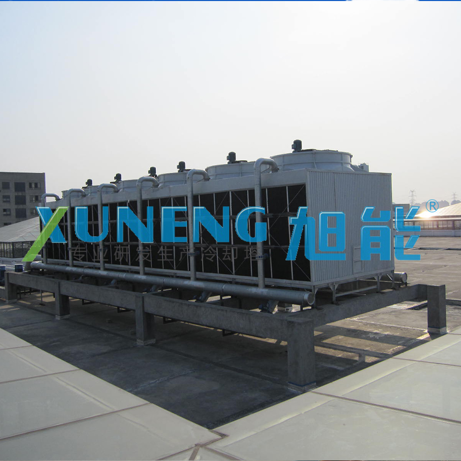 方形橫流式冷卻塔采用兩側進風,靠頂部的風機,使空氣經由塔兩側的填料,與熱水進行介質交換,濕熱空氣再排向塔外。填料采用兩面有凸點的點波片,通過安裝頭使點波片粘結成整體,以提高剛性,兩面的凸點還可避免直接滴水,因此提高了水膜形成能力,填料尾部設有收水措施。