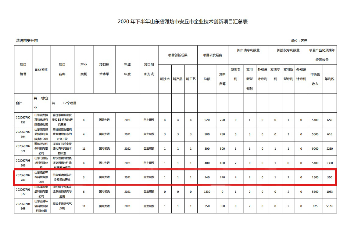 山東旭能環保科技有限公司堅持企業技術創新,為企業增強自主創新能力和核心競爭力,提高產業技術研發水平和創新成果產業化水平,特自主研發生產了“節能型噴霧推進冷卻塔”,經各市、省有關單位推薦和專家論證認定通過《山東省技術創新項目》。