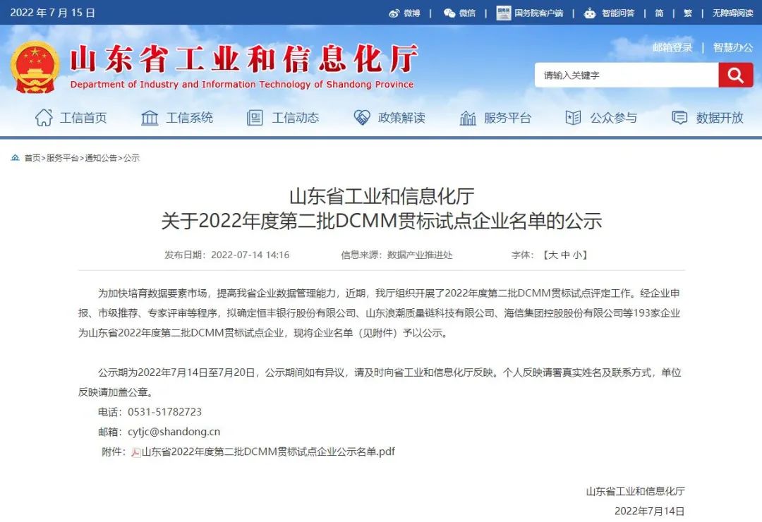 7月14日,省工信廳在官網公示了被認定為2022年度省第二批DCMM貫標試點的企業名單,山東旭能環保科技有限公司榮列其中,排名在濰坊所有試點企業之首且為安丘首家試點企業。