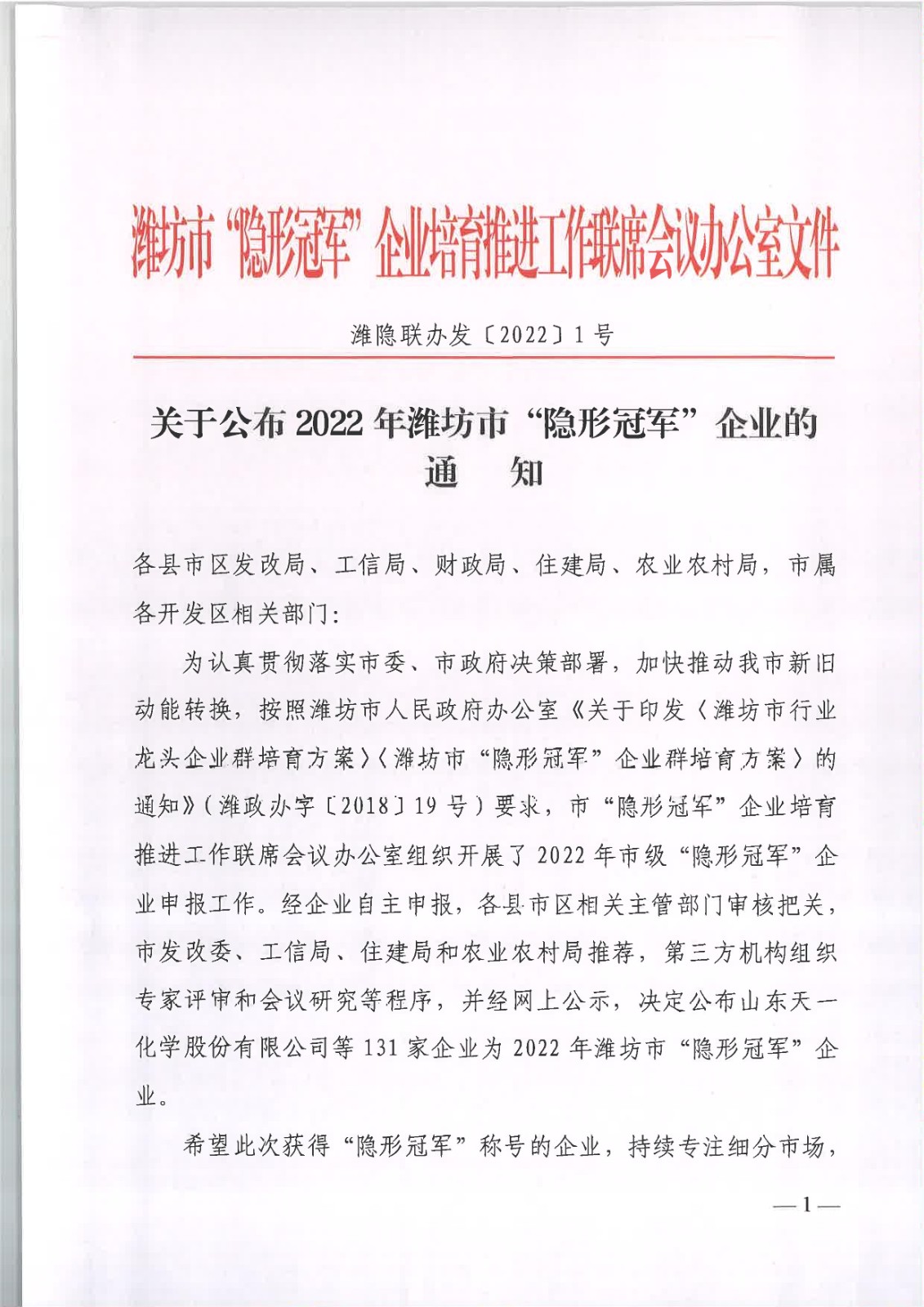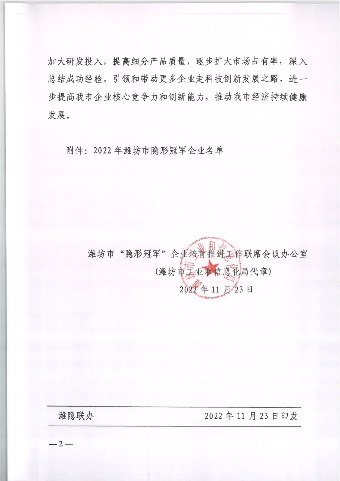 山東旭能環保科技有限公司經自主申報,經相關部門審核推薦、第三方機構專家評審等多個環節比拼脫穎而出,獲評2022年濰坊市“隱形冠軍”稱號。